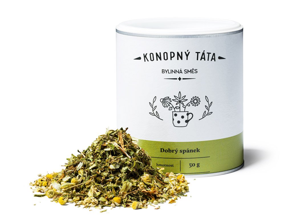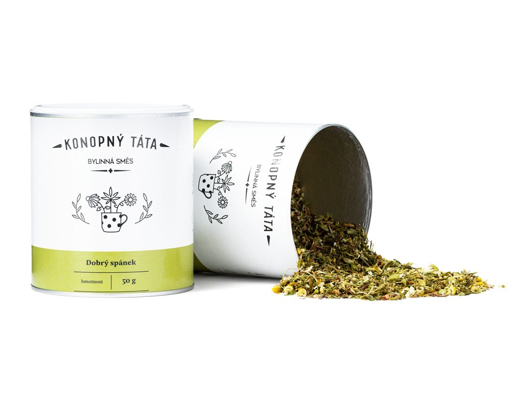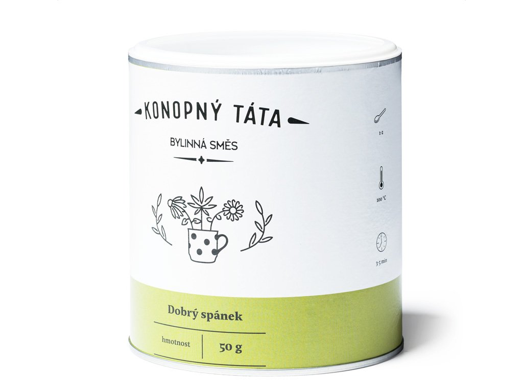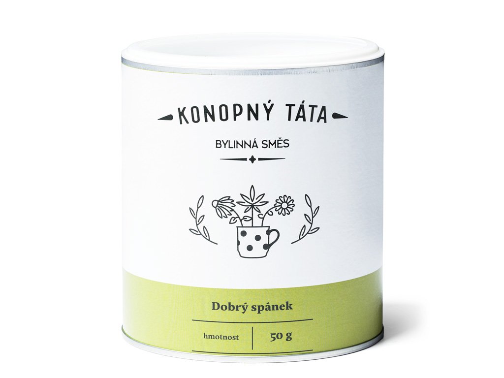 Konopný čaj Dobrý spánek značky Konopný Táta je harmonická bylinná směs s vysokým podílem konopí (70 %), doplněná o tradiční byliny používané při večerním zklidnění a relaxaci.